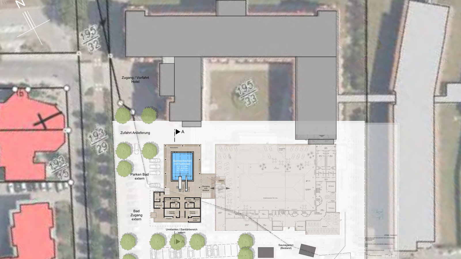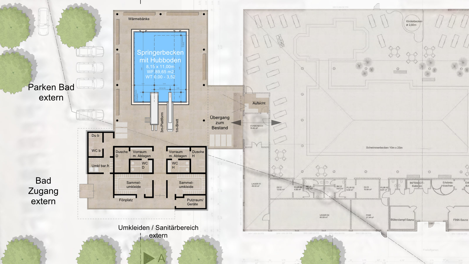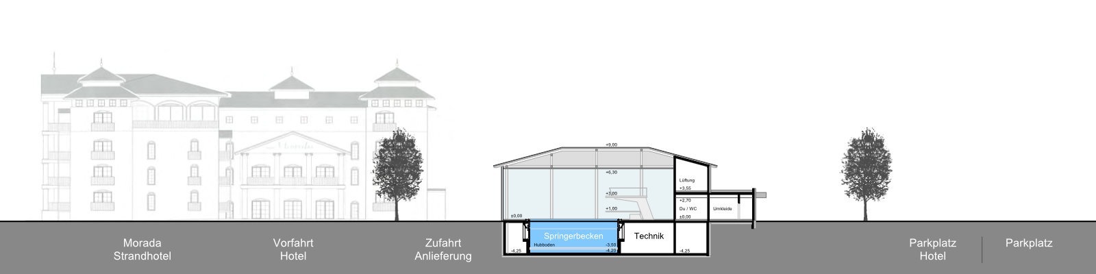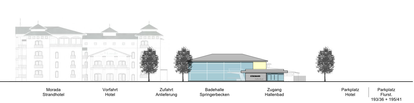 Aufgabenstellung war die Erstellung einer Machbarkeitsuntersuchung mit Flächenprüfung und Raumprogrammerstellung, sowie entsprechender Kostenbewertung für die Erweiterung des Hallenbades Kübomare in Kühlungsborn. Die Erweiterung umfasst ein Springerbecken mit Hubboden, 2 Sammelumkleiden und die entsprechenden Sanitäreinrichtungen sowie die notwendigen Technikflächen.
