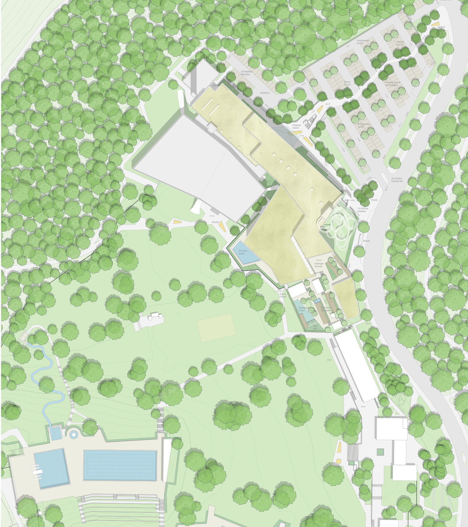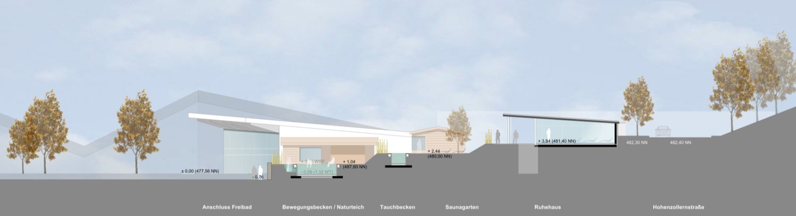 Die neu geschaffene Badehalle des Familien-/Freizeitbades erhält über eine weitgehende Öffnung der Fassaden in Richtung Süden und Westen größtmögliche Blickbezüge zum Außenbereich und dem Baumbestand des Freibades. Sowohl Badehalle als auch der Saunabereich im Obergeschoß erhalten ergänzend große Dachoberlichter zur natürliche Belichtung und Belüftung.