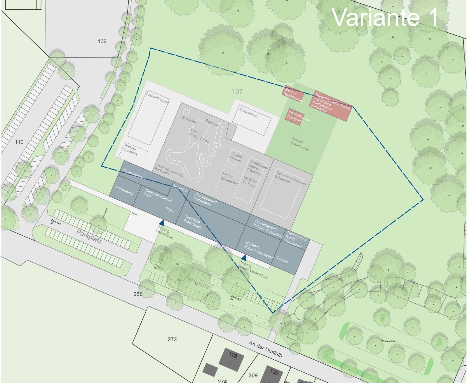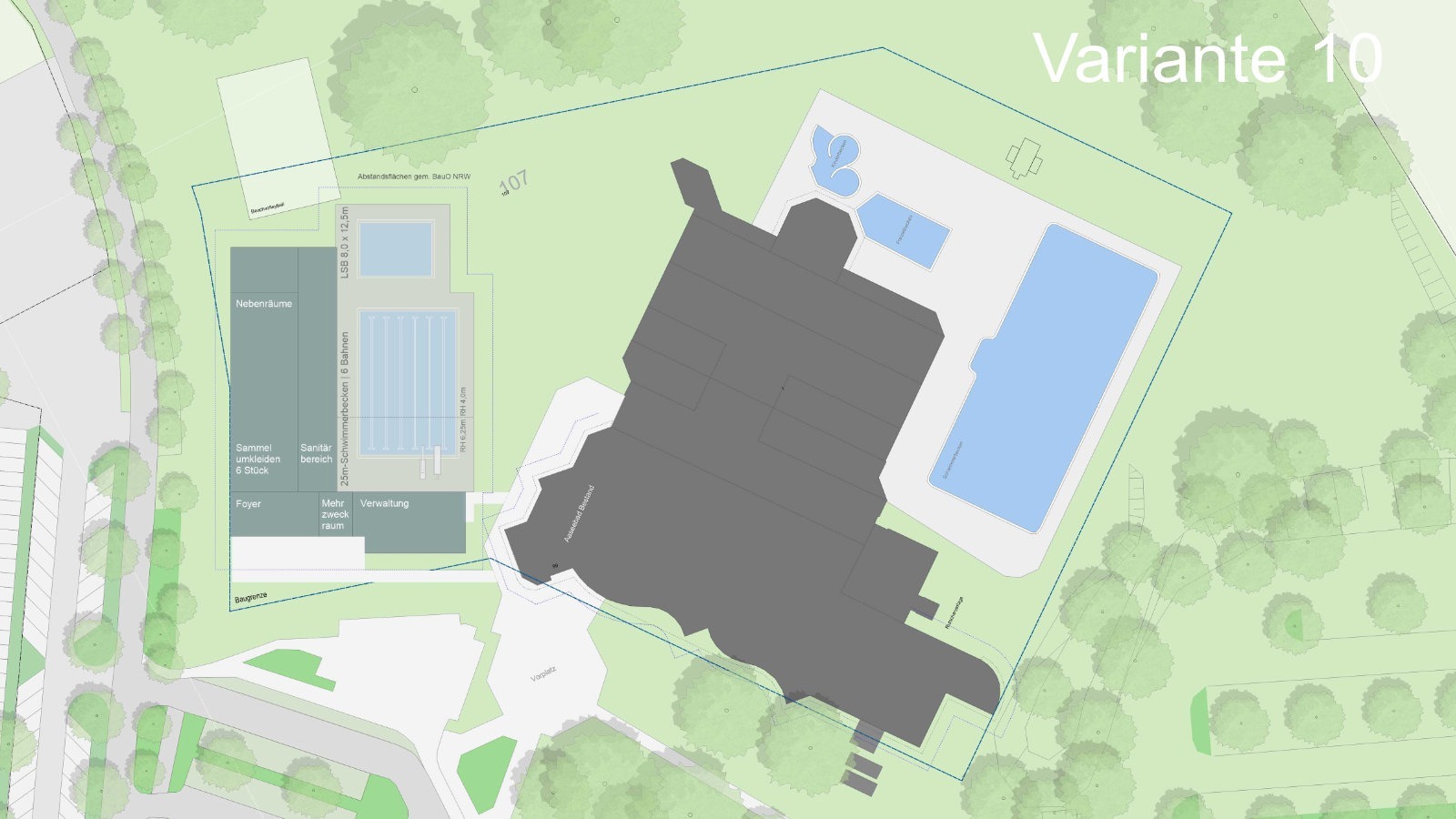 Aufgabenstellung war die Erstellung einer Machbarbarkeitsuntersuchung für den Neubau des Aaseebades in Ibbenbüren. Bestandteil der Machbarkeitsstudie war die Flächenprüfung und Raumprogrammerstellung, die Verortung des Bauvolumens auf dem freigemachten Grundstück, die kostentechnische Bewertung, sowie die Erstellung einer funktionalen Leistungsbeschreibung (TÜ-Ausschreibung) als Grundlage der Vergabe.Um eine möglichst große Bandbreite an Konzeptvarianten als Entscheidungsgrundlage zu erhalten, wurde die Studie in 10 Varianten mit Untervarianten erstellt. Dabei umfasst die Studie sowohl Neubauvarianten in verschiedenen Größenordnungen, als auch Varianten mit dem Grundgedanken des Bestandserhaltes und der Ergänzung von notwendigen Wasserflächen für den Vereins- und Schulsport.