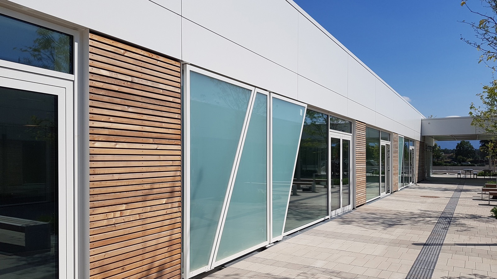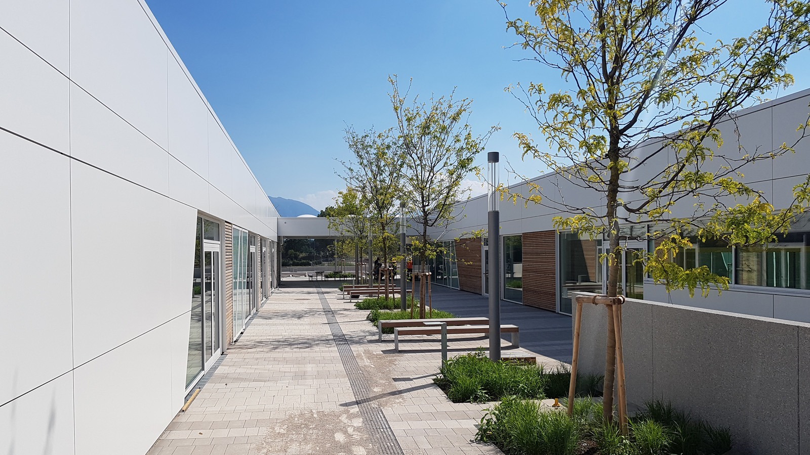 Die Passage zwischen Hallenbad und Sporthalle verknüpft die Funktionen von Wegeführung mit der multifunktionalen Nutzbarkeit einer den Gebäuden vorgelagerten Freifläche.