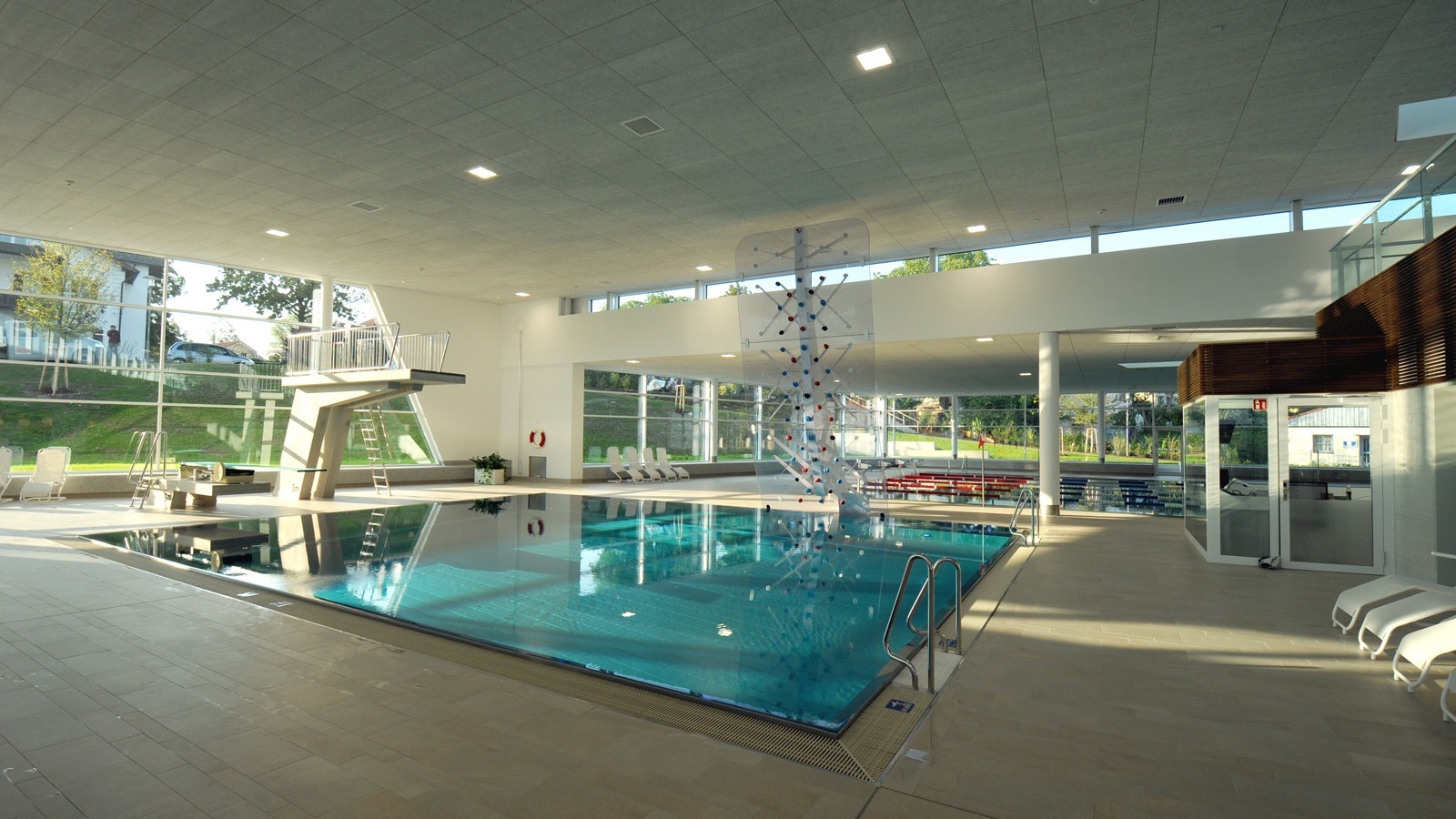 Im Hallenbad werden ein 25m-Schwimmer-becken, ein Springerbecken mit 1m-Brett/3m-Plattform, Hubboden und Kletterwandanlage, ein Lehrschwimmbecken mit Attraktionsbereich und ein attraktiver Eltern-Kindbereich realisiert. Eine Schwimmbadgastronomie, welche auch den Foyerbereich und den vorgelagerten Campus bedienen kann, rundet das Angebot ab.