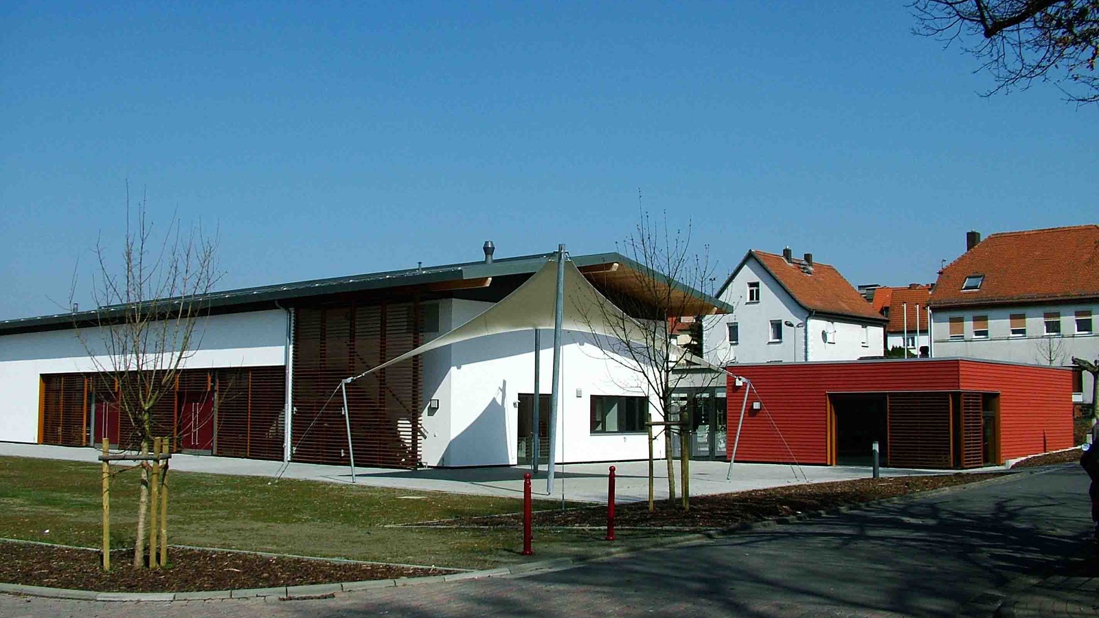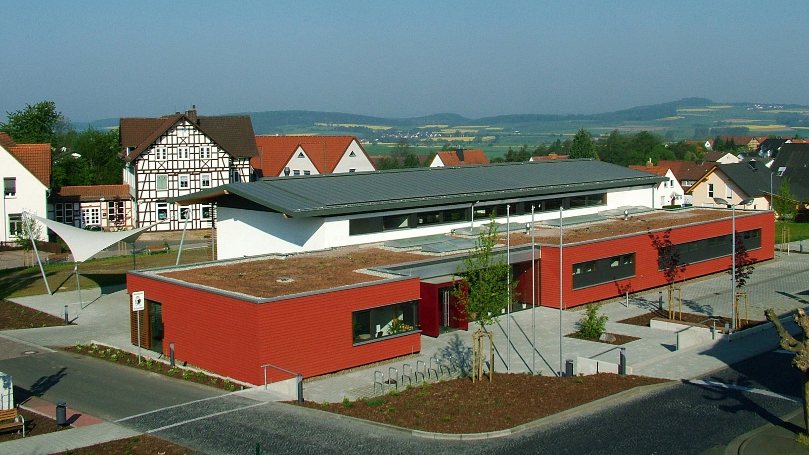 Der Neubau des Bürgerhauses der Gemeinde Ebsdorfergrund orientiert sich mit seinen Freibereichen zur südwestlich gelegenen Schule und dem Kinderspielplatz.