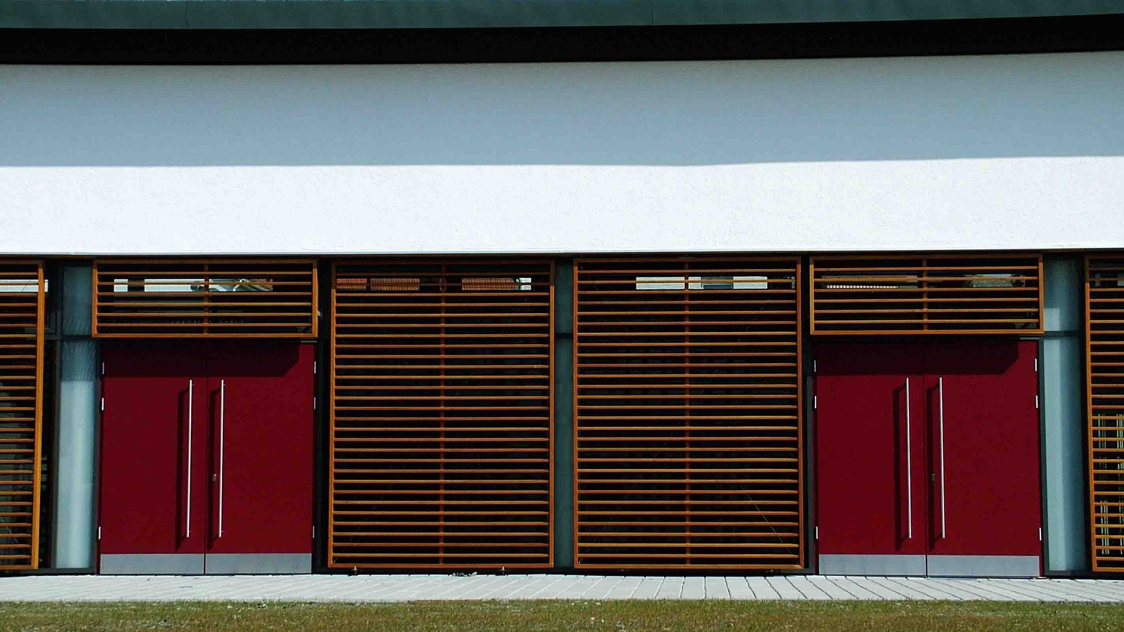 Die Gestaltung der Außenfassaden wird durch flächige Putzbereiche, offene Holzschalungen und großzügig verglaste Bereiche geprägt.