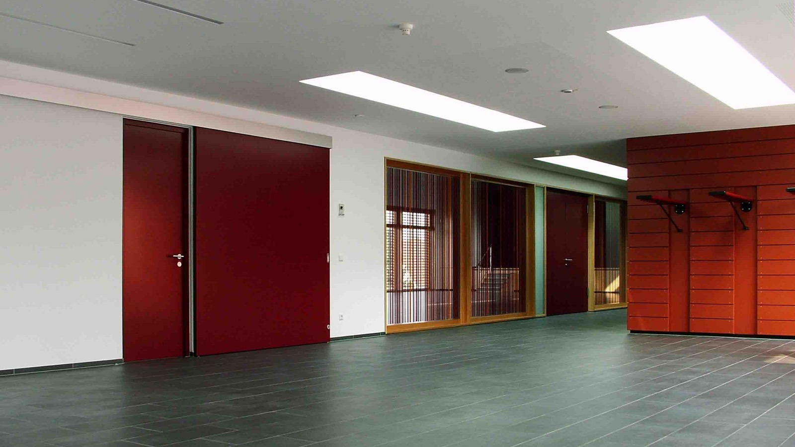 Die einzelnen Bereiche sind über eine großzügige, mit Oberlichtern ausgestattete Foyer- und Flurzone zusammenschaltbar.