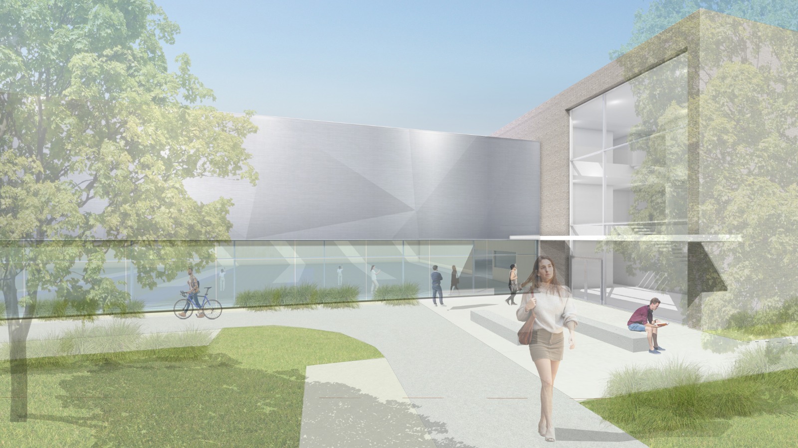 Schulsportbereiche und funktionale Baukörperteile werden formal bewusst ruhig gehalten und nehmen mit ihrer hellen Klinkerfassade die Materialität der denkmalgeschützten Basilika auf. Das Säbelfechtzentrum präsentiert jedem Besucher und Aktiven durch seine metallisch auffälligen Fassadengestaltung und den darin thematisch aufgenommenen „kreuzenden Klingen“ die Sportart Säbelfechten eindeutig bereits bei der ersten Annäherung.