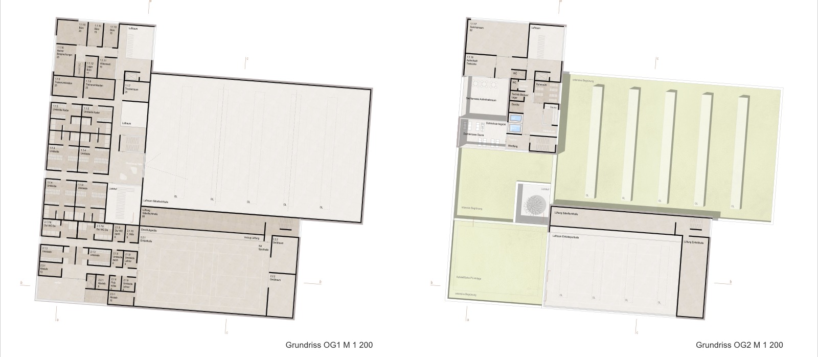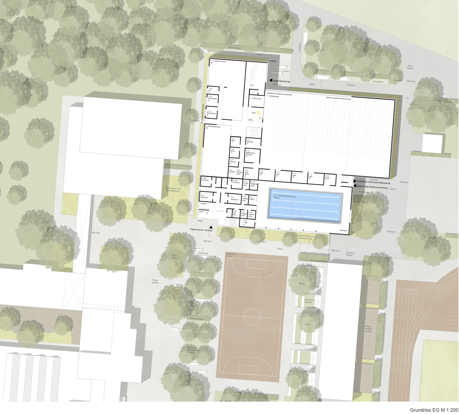 Schwimmbad und Einfeldsporthalle liegen übereinander, dem Pausenhof zugewandt und werden über einen gemeinsamen Foyerbereich von Süden erschlossen. Das Schwimmbad befindet sich mit seinen Umkleide- und Nebenflächen im Erdgeschoß und öffnet sich über eine großzügig angelegte Pfosten-Riegel-Fassade nach Süden zum Pausenhof. Die Sporthalle liegt mit einer analogen Raumstruktur im 1. Obergeschoß und wird über ein Lichtband in der Fassade und Oberlichter natürlich belichtet.