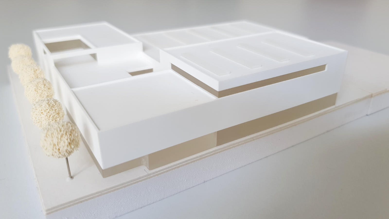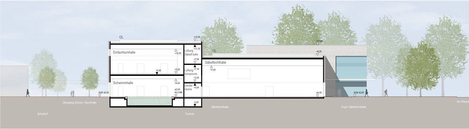 Der Erweiterungsbau des Bundesstützpunktes mit Schwimmbad und Einfeldsporthalle nimmt sich in der Höhenentwicklung auf das jeweils notwendige Maß zurück, bleibt damit sehr wirtschaftlich und auch in der Architektursprache bewusst reduziert und klar. Die architektonische Kraft des Entwurfes entsteht durch das Zusammenspiel eindeutig definierter Gebäudevolumen und reduzierter Materialität. Sowohl der Bundesstützpunkt Säbelfechten wie auch die unterschiedlichen schulischen Gebäudefunktionen lassen sich eindeutig von außen ablesen. Über die Baukörperstellung und Zugangsdefinitionen entsteht ganz selbstverständlich die notwendige Zonierung zwischen Bundesstützpunkt und Schulbetrieb.