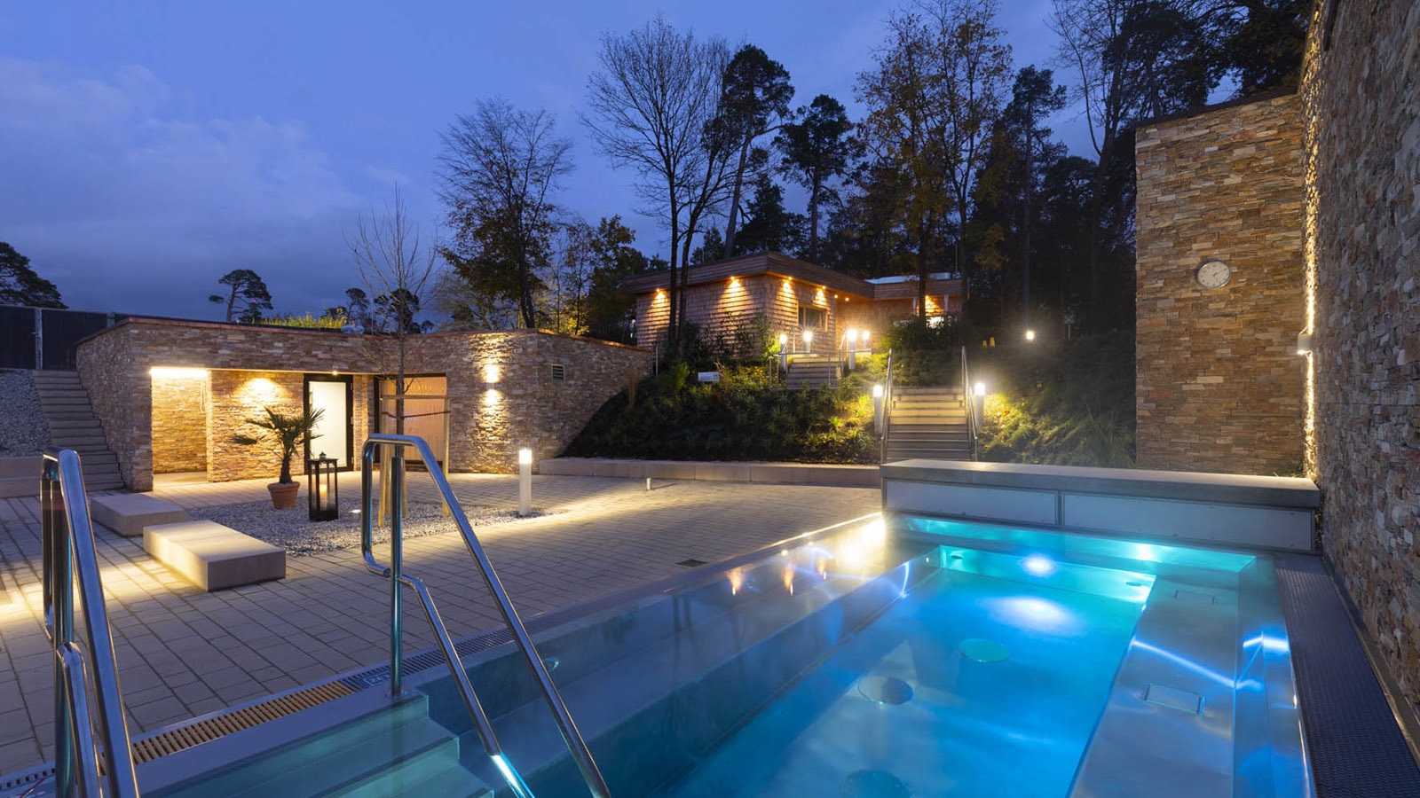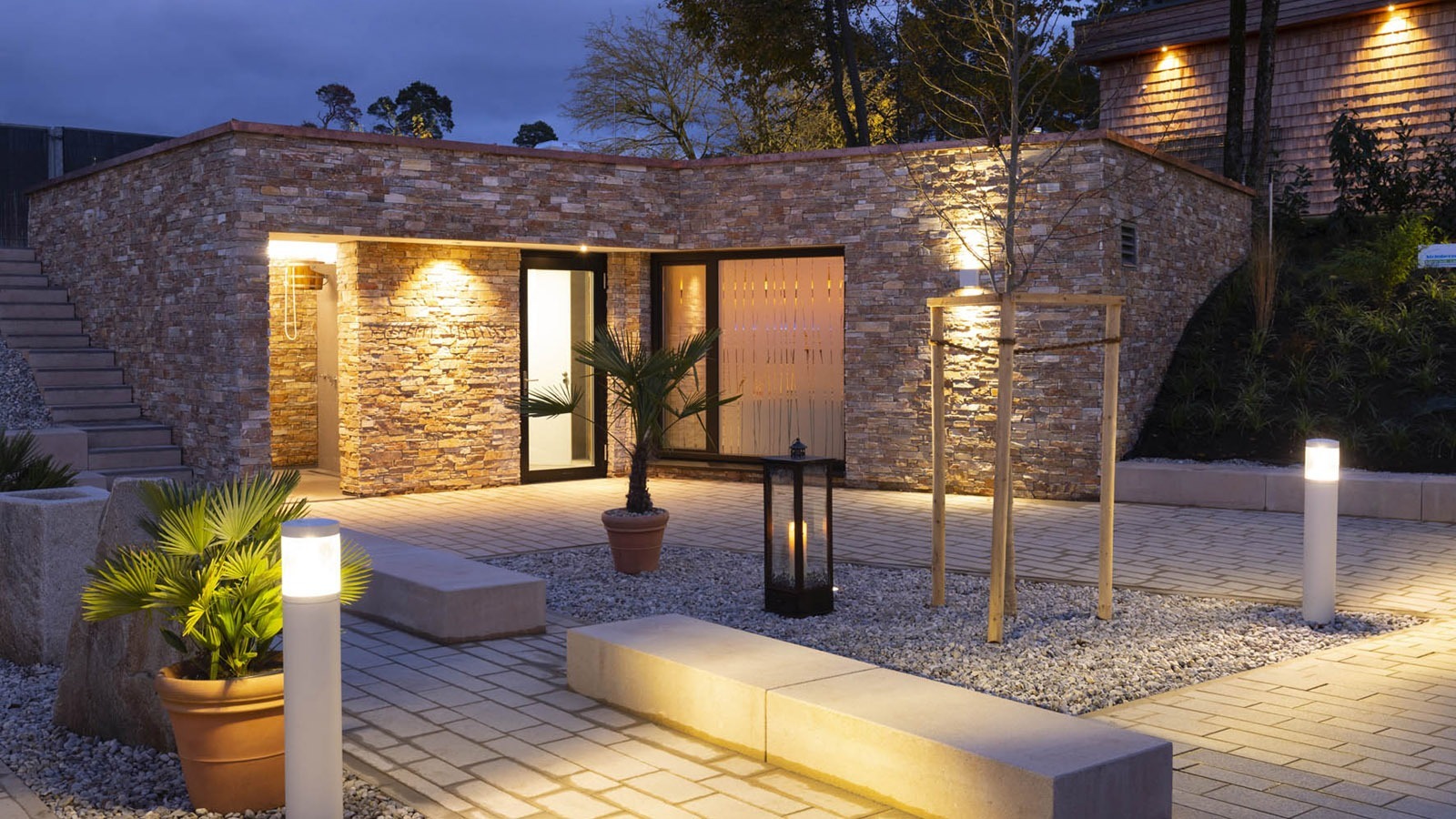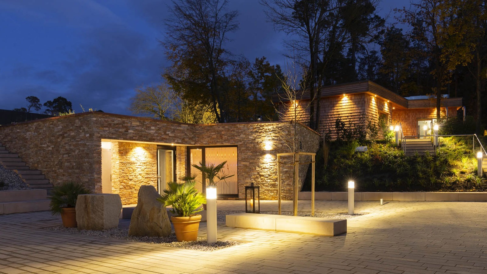Nach Inbetriebnahme der Umbau- und Erweiterungsmaßnahmen im Freizeitbad ‚Aaquariush‘ im Frühjahr 2018, realisiert nach Planung der Löweneck + Schöfer Architekten GmbH, wurde die aus dem Altbestand in die neue Freianlagenplanung integrierte Blockhaussauna durch einen Brandschaden irreparabel beschädigt und zerstört.Bereits kurz nach dem Brandereignis war klar, dass die mitten in der neuen Saunalandschaft gelegene zerstörte Altsauna schnell durch einen ansprechenden Neubau ersetzt werden muss. Dieser sollte so konzipiert werden, dass er sich in die Gestaltung der Saunalandschaft einfügt und das bestehende Angebot schlüssig ergänzt.Nach einer einer Konzeptstudie im November 2018 erfolgte der Planungsauftrag. Entwurfs-, Genehmigungs- und Ausführungsplanung wurden zeitlich sehr kompakt im Zeitraum von 12/2018 – 05/2019 umgesetzt.Die Realisierung erfolgte ab 05/2019 als Neu-/Ersatzbaumaßnahme im weiterlaufenden Sauna- und Hallenbadbetrieb und unter Anschluss an die bestehene Gebäudetechnik.Der Neubau ist als ‚Erdauna‘ in einen bestehenden Geländehang integriert und und lebt im Innenbereich aus dem Kontrast zwischen Altholz und Naturstein. Die große Hochtemperatursauna mit Ausblick ins Freie verfügt über einen eigenen überdachten Erlebnisduschbereich. Die Außenfassaden nehmen die Sprache aus Naturstein und Holz des vorhergehenden Bauabschnitts wieder auf. Im Rahmen der Baumaßnahmen wurde auch eine großer Teil der Freianlagen zwischen dem Gebäudebestand, Sauna-Außenbecken und dem Neubau neu gestaltet. Die Freianlagen ziehen sich dabei als begrünte Dachfläche auch bis auf die Erdsauna.Der Saunaneubau wurde als ‚Bergl Sauna‘, benannt durch den Auftraggeber nach einem in unmittelbarer Nähe liegenen Waldgebiet.