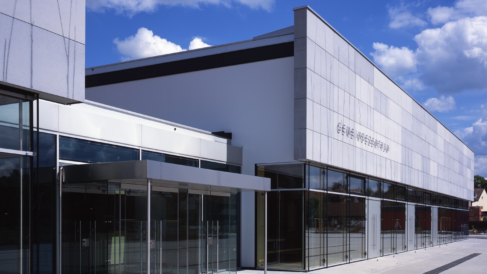 Das neue Gemeindezentrum der Gemeinde Neuhof orientiert sich mit den wesentlichen repräsentativen öffentlichen Funktionen zum neu gestalteten Veranstaltungsfreibereich nach Südwesten. Alle Nebenraumzonen liegen funktional zusammengefasst auf der Nordost-seite des Baukörpers.