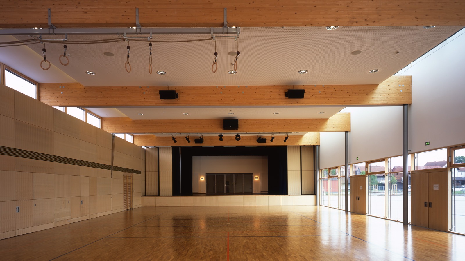 Die Kulturhalle wird sowohl für Gemeinde-, Thater- und Konzertveranstaltungen als auch für den Vereins- und Grundschulsport genutzt. über einen großzügigen Foyerbereich können die Kulturhalle und ein Veranstaltungssaal bei Bedarf direkt zusammengeschaltet werden. Die durchgehende Flurzone mit Anbindung an den Foyerbereich erlaubt veranstaltungsabhängig