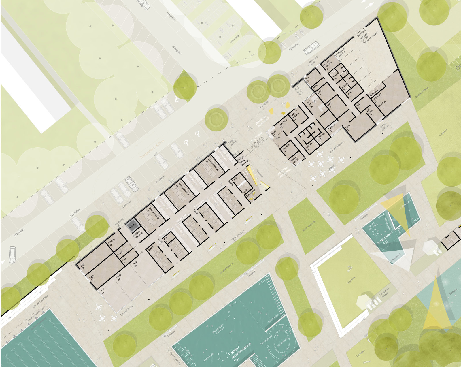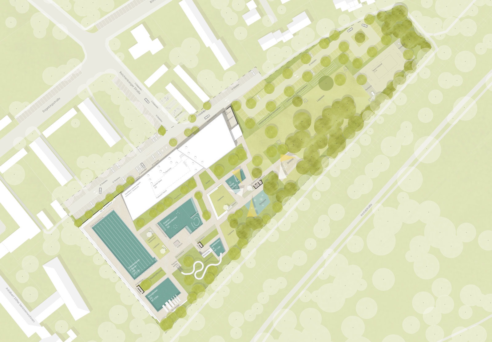 Die polygonale Formensprache der Gebäudearchitektur setzt sich in der Gestaltung des Freibadgeländes fort. Pflanz- und Wiesenflächen verzahnen sich mit der Badeplatte und der neuen Beckenlandschaft. Diese ist durchwegs barrierefrei und schwellenlos angelegt und konzentriert sich auf den östlichen Grundstücksbereich. Der im Bestand vorhandene Höhensprung um das 50m-Becken wird durch das Höhersetzen des Beckenkörpers mit Umgangsfläche aufgelöst. Neben der großzügigen Liegewiese im östlichen Bereich werden in unmittelbarer Nähe zu den Schwimmbecken zahlreiche Aufenthaltsbereiche angeboten. Holzdecks, Sitzstufen und angelagerte Langbänke bieten vielfältige Sitz- und Liegemöglichkeiten innerhalb der Badeplatte und laden zumSonnenbaden ein. Baumüberstellte Pflanzflächen spenden Schatten und gliedern die Badeplatte in unterschiedliche Nutzungsbereiche. Ein grüner Rahmen mit Bestandsbäumen und Neupflanzungen fasst das Freibadgelände ein.