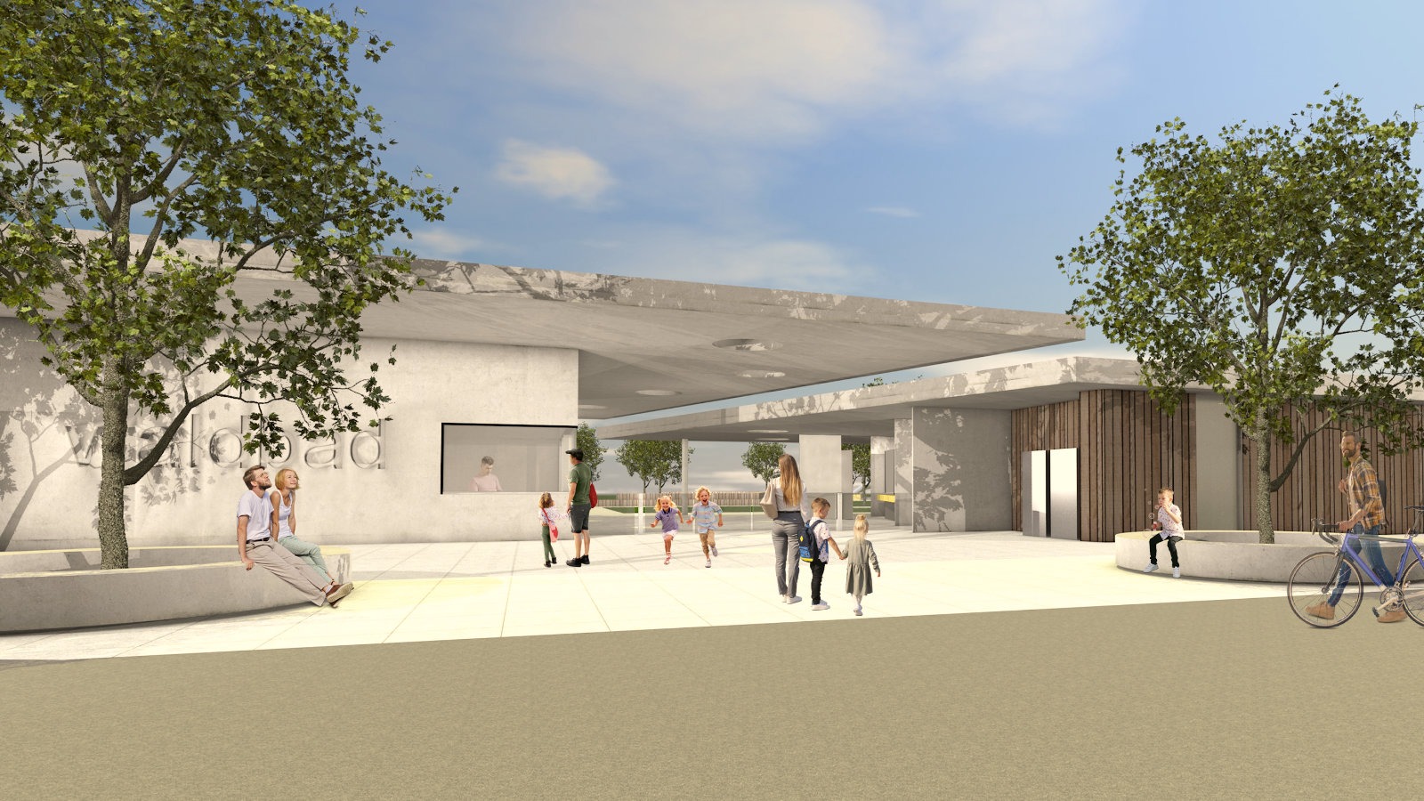 Der Neubau des Freibadgebäudes wird als seinen inneren Funktionen entsprechend zweigeteilter Baukörper hergestellt. Das langgestreckte Bauvolumen zoniert im erforderlichen Maß zwischen Stellplatzbereich und Freibadgelände. Durch seine reduzierte Höhe, die aufgebrochene Struktur im Eingangsbereich, ein Fassadenspiel aus offenen und geschlossenen Flächen wird dabei die Wirkung einer massiven Barriere vermieden. Polygonale, schwebend wirkende Dachscheiben verbinden die Baukörperteile untereinander.