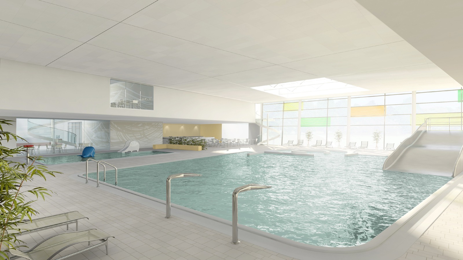 Alle Nutzungen werden direkt von einer zentralen Eingangshalle erschlossen. Für Schüler- und Vereine wird ein eigener Zugang im Bereich der Sammelumkleiden mit direkter Wegeführung zu Lehr- und Sportbecken angeboten.