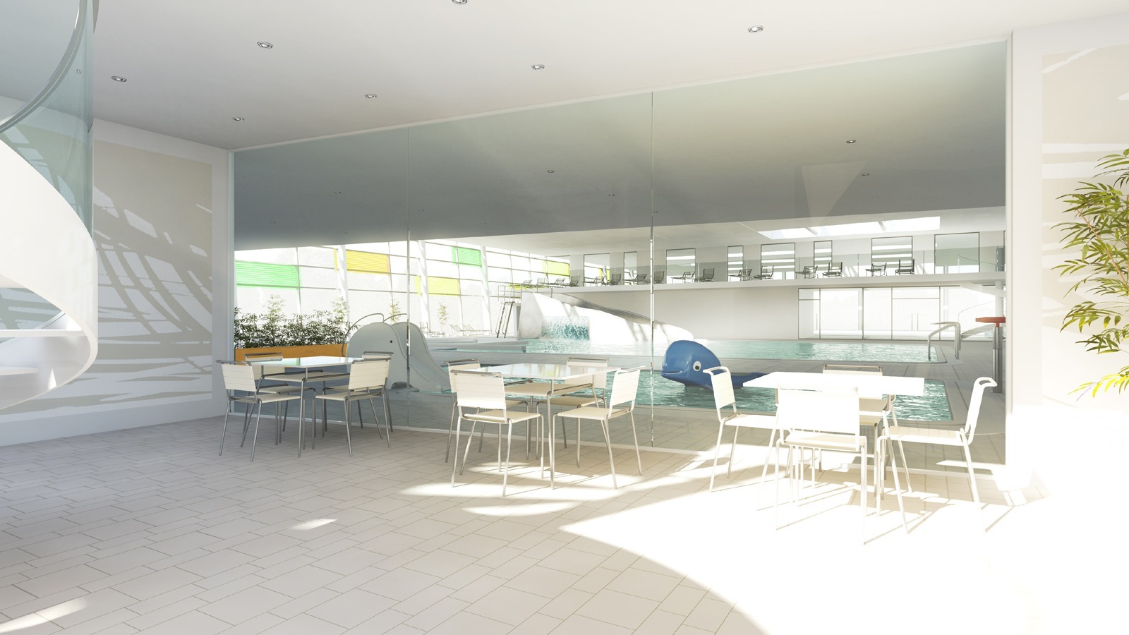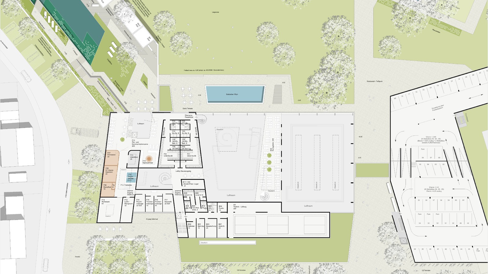 Innerhalb des Gebäudes sind alle Funktionen der Badeplatte schwellenlos angeordnet. Das Sauna- und Wellnessangebot liegt überwiegend im Obergeschoss, verfügt jedoch über barrierefreie und direkte Anbindungen in den Saunagarten auf beiden Ebenen. Die klare Gliederung der Nutzungsbereiche Gastronomie, Sport- und Freizeitbad und Sauna gewährleistet eine leicht verständliche, funktionale und kreuzungsfreie Besucherführung.