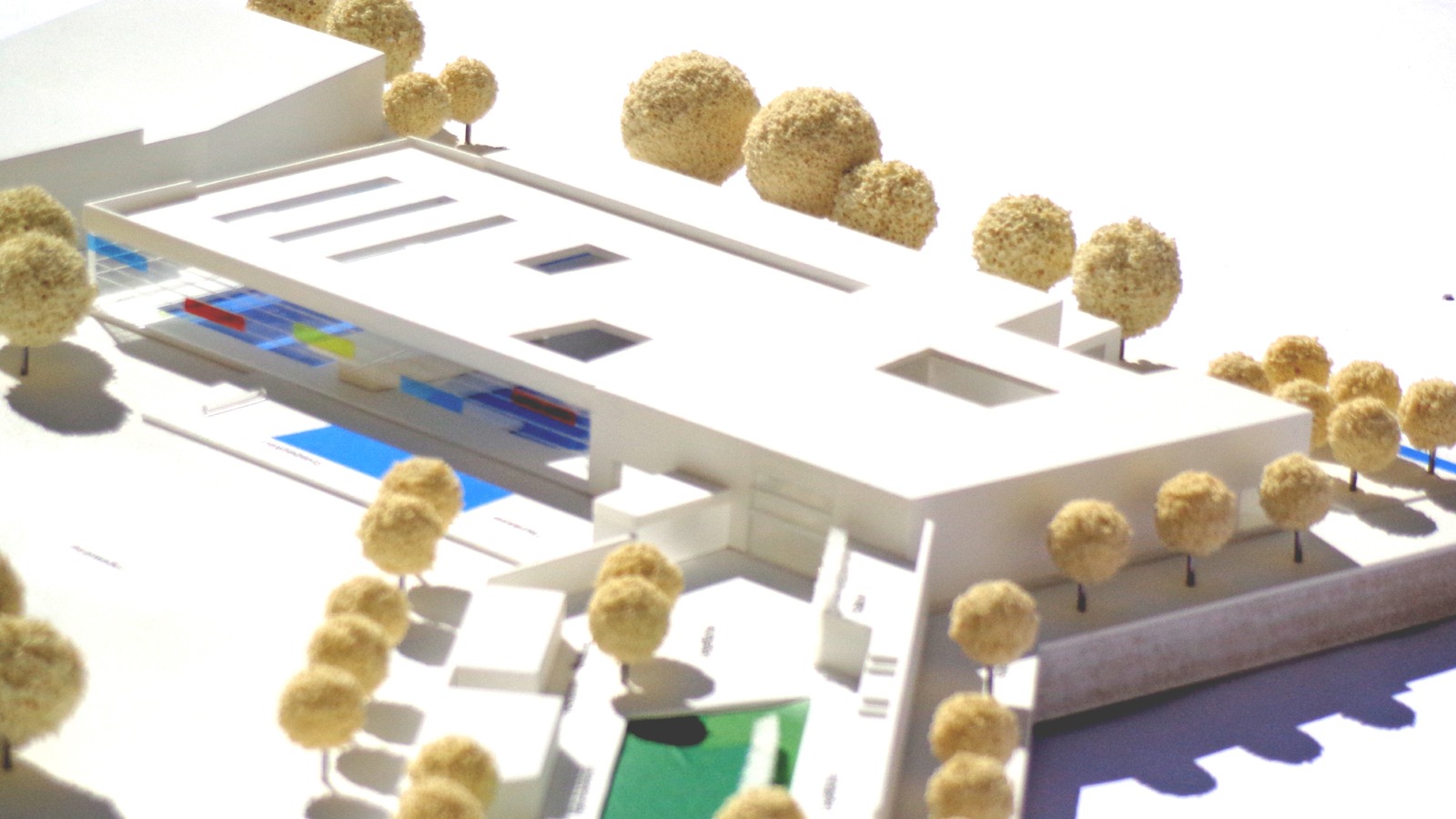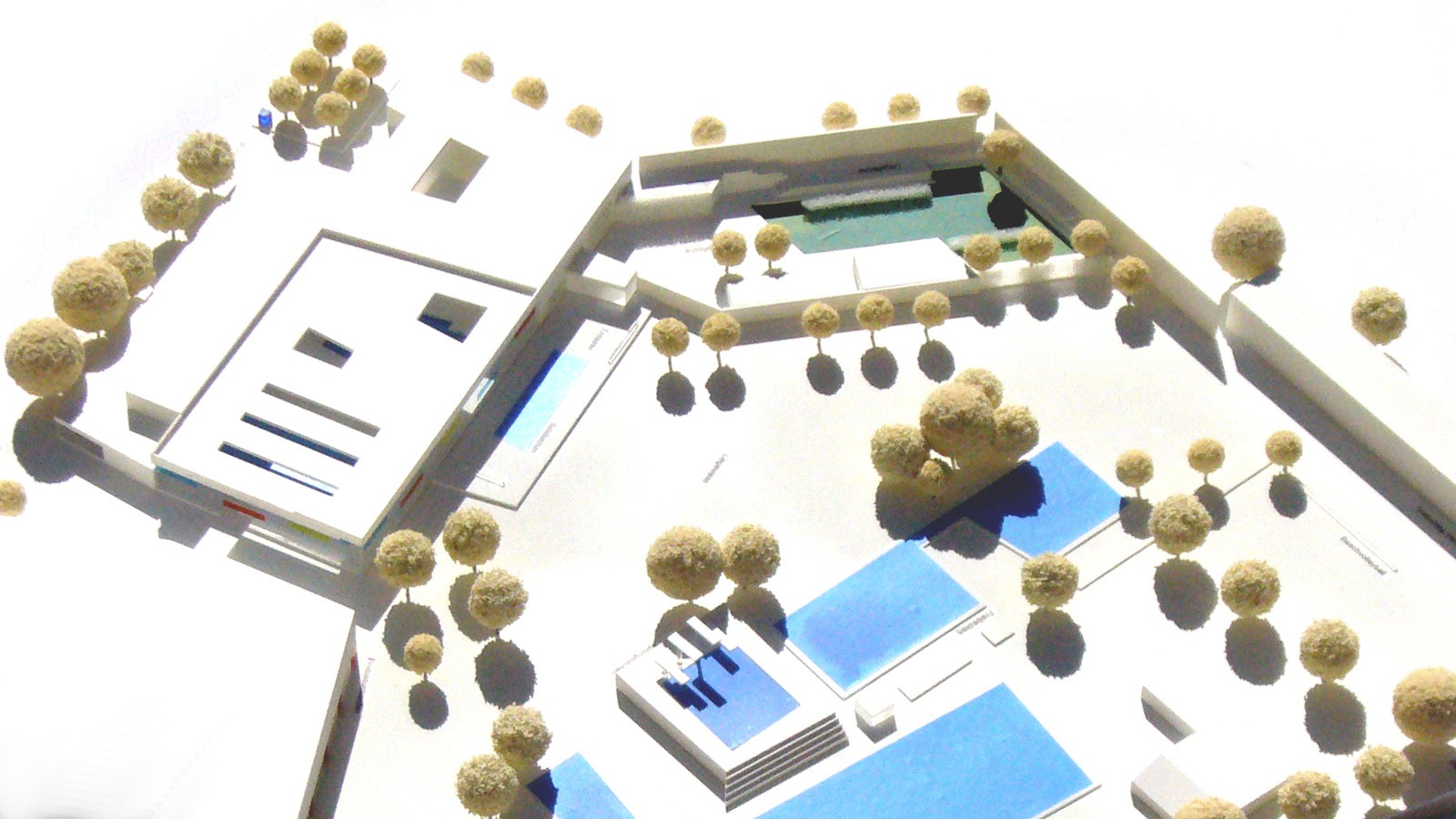 Der Zugang zum Freibad erfolgt über eine gut proportionierte Fuge, das Hallenbad erhält im Bereich der süd-westlichen Straßenkreuzung einen repräsentativen Vorplatz. Die Erschließung vom öffentlichen Raum ist klar organisiert und für den Badebesucher einfach nachvollziehbar.