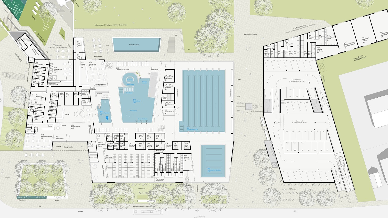 Der Entwurf positioniert das neue Bad kompakt im Süden des Grundstücks am Rabenweg. Zu den angrenzenden Wohngebieten wird ein angemessenes Vorfeld erzeugt.