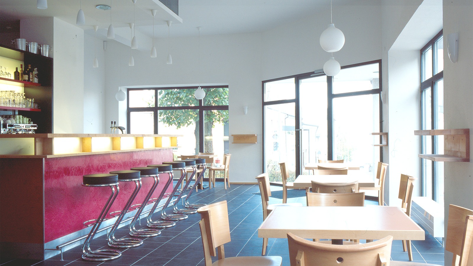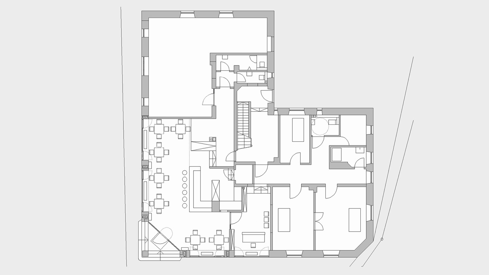 Ziel der Umbaumaßnahme war die Integration einer Praxis für Krankengymnastik, eines Fitness- und Gymnastikbereiches mit Sauna und Solarien und eines kleines Cafes als offenes Raumkonzept in die denkmalgeschützte Gebäudestruktur.